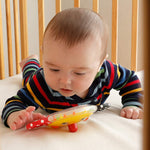 赤ちゃんを笑顔にするスマイリーフェースラトル。お鼻は、押すとピュッと鳴ります。両手で握ってビーズをころがすラトル。裏は鏡で「自分のお顔にびっくり!」